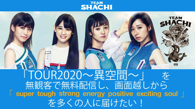 なお、TEAM SHACHIは公演の延期や中止が相次ぐ中で無観客ライブを配信するにあたり、クラウドファンディングプラットフォーム「we fan」を通じて支援を募集している。寄せられた資金は、<TOUR 2020 ~異空間~>での公演延期・中止に伴う会場費などの運営費、ステージ制作費、無観客ライブ収録制作費などに充当される。