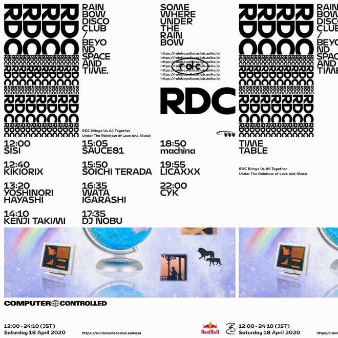 その注目のタイムテーブルが発表になった。ラインナップはDJ Nobu、Kenj iTakimi、Yoshinori Hayashi、Sisiに加えて、Soichi Terada、Wata Igarashi、sauce 81、Kikiorixという<RAINBOW DISCO CLUB>に縁のある実力派アーティストたち。さらにレッドブル・ステージに出演予定だったアーティストLicaxxx、CYK、machìnaが登場する。