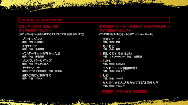 初回限定盤に付属のDVDには、<全国ツアー2019~三途ノ川~>の東京・マイナビBLITZ赤坂公演や、2019年の敬老の日に行なわれた弾き語り公演のダイジェスト映像が収録される。こちらにも特典映像の追加収録が決定している。