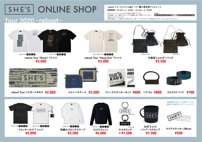 ツアーの開催中止に伴い、SHE’Sオンラインショップでは4月21日(火)よりツアーグッズの通販が行なわれる。購入者には先着で、同公演で使用予定だったオリジナル銀テープがプレゼントされるという。チケットの払い戻しやグッズ販売に関する詳細はオフィシャルサイトにて。