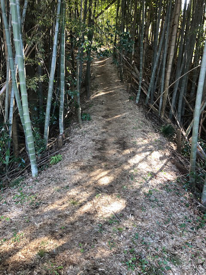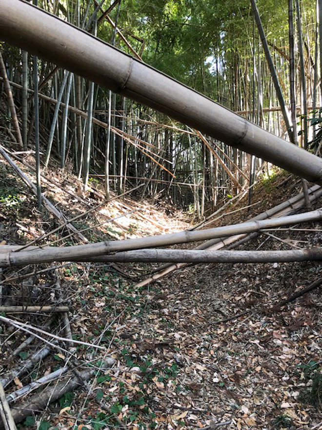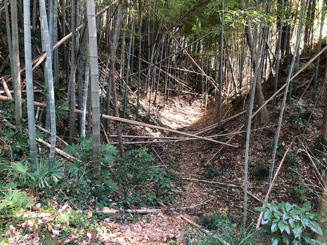 木戸口に着くと城の平面図の掲示板がある。確かにこれだけを見ると小さな城と思われてもしょうがない。だがここの三ノ郭もとんでもなく広い。城と逆側に降りられる細い虎口もあり、城の導線がそのまま現在の道になって使われていることにテンションが上がる。さて、ここから城内に入って行くわけだが、まずこの木戸口の土橋がたまらない。割と細く峰不二子の腰ばりにくびれている。その両サイドに落ちた空堀の深さにまずやられる。どうしても木が生い茂り、竹藪になってしまっているので深さがわかりづらいかと思うが、ある意味ここがもう一つの大手であることは間違いないのでその防御たるもの、凄まじい。そしてニノ郭に向かうまでにすぐまた土橋があり、ここに来るまでに左側に2本の空堀がその行く手を阻もうとしてくる。ここで気付くがニノ郭の土塁の高さが凄い。圧巻である。城内にはL字になった縦と横の空堀があるが、横に伸びた空堀の深さが凄まじい。腰曲輪を歩くと左側にニノ郭があるわけだが、土塁の高さ、そして左右から攻撃される仕組みに脱帽。防御というより簡単に仕留められる構造は本当に素晴らしい。むしろ攻撃に徹している作りだと言える。
