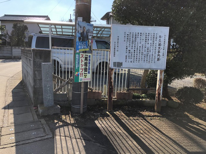 まず大手門だが、これはマニアにしかわかりづらいことかもしれないが大手門周辺の道が既に喰い違い虎口になっていることがわかる。掲示板によると枡形の馬出しも備えてある壮大な大手門だったとのこと。牛久陣屋が建てられた後も城の入り口はこの大手門だったとされる。右に歩いて行くと空堀の跡も見て取れる。大手門から城に向かう道も当時は根古屋であり、言わば武家屋敷、家来たちの住居となっていた。城跡のあるあるだが、こうした当時の城内の敷地に現在暮らしている方々は何かしらの末裔だ。三の丸の入り口である木戸口を目指しながら住宅地を歩くと家の外側に、これどう考えても土塁だろと思う場所に遭遇する。かなり羨ましい。道も虎口になっており船着場へ降りて行く構造になっていたりする。現在の道も当時の武家屋敷の道とほぼ変わらない。