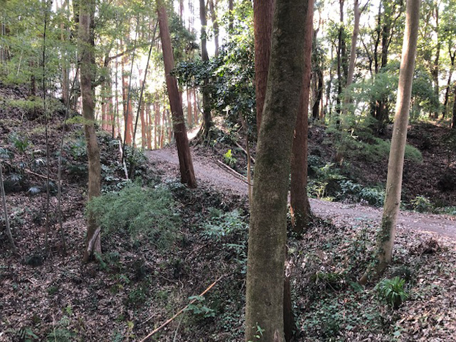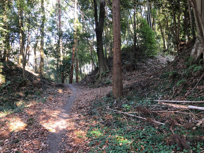 ここから更に城の奥へ。当時はニノ郭から本郭までの導線は木橋が架けられていただろうが、現在は腰曲輪に出ないと本郭には行けない構造である。ここで牛久城の一番の見所だが、ニノ郭と本郭の間の横の堀、ここがまた素晴らしい。土塁の高さ、堀の深さ、同じ茨城県でも小幡城に負けていない。これぞまさに中世城郭、北条氏の築城技術も垣間見られるのは1500年代半ばに建てられた城ならではかもしれない。この堀を歩くのがマニアの中でもお約束になっていて、牛久城の写真となると大抵はこの堀の中から左にニノ郭の土塁、右に本郭の土塁を写したものになる。この堀を歩いて抜けると奥は右に折れ曲がっており、当時はもう一つ曲輪が存在したとのこと。この堀に限らずだが藪を行く場合は倒れた木や枝には十分注意していただきたい。何を隠そう私、2度目の牛久城のこの空堀で枝が見えず思い切り左目の目蓋にぶっ刺してしまった。軽傷で済んだがいつまで経っても赤みが取れず治らないので18年お世話になっているヘアメイクの松本さんに撮影の時に聞いてみたら「ああこれね、治ってないんじゃなく、もうシミになってるだけです」と言われてしまう。41歳、年齢にはかなわない。