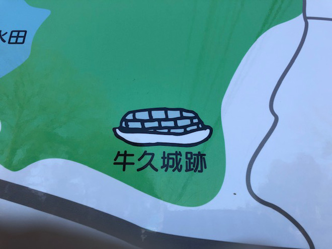 この辺一帯はカッパが有名とのことで大手門から木戸口までの道の途中の駐車場に「カッパの里 散策コース」と書かれた絵の掲示板があり、この周辺の歴史を絡めながらのウォーキング出来るコースが紹介されていた。しかしこの掲示板の牛久城の絵が凄い。良く見てみると、白い船に石垣が乗っている。ちょっと待ってくれ。牛久城は一切石垣がないのに、だ。やってくれるではないか。野球を知らない人間が打った後に3塁に走ってしまうレベルである。いや、それでもこの名城を紹介してくれてるだけ愛があると思いたい。ただ城マニアの中ではこの絵を見ることがちょっとしたお約束になっている。しかしこの絵、このタッチ、誰かが書いた絵に似ている、絵心があるのかないのか微妙なライン、それでいながら人を笑わせてくれるような、でも本人は笑わせるつもりもなく本気で書いたらそういう絵になったというような。