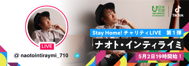 ナオト・インティライミが、ショートムービープラットフォーム「TikTok」と日本財団による新型コロナウイルス緊急支援事業に賛同し、5月2日(土)に行なわれるチャリティライブ<Stay Home! チャリティLIVE>に出演することを発表した。