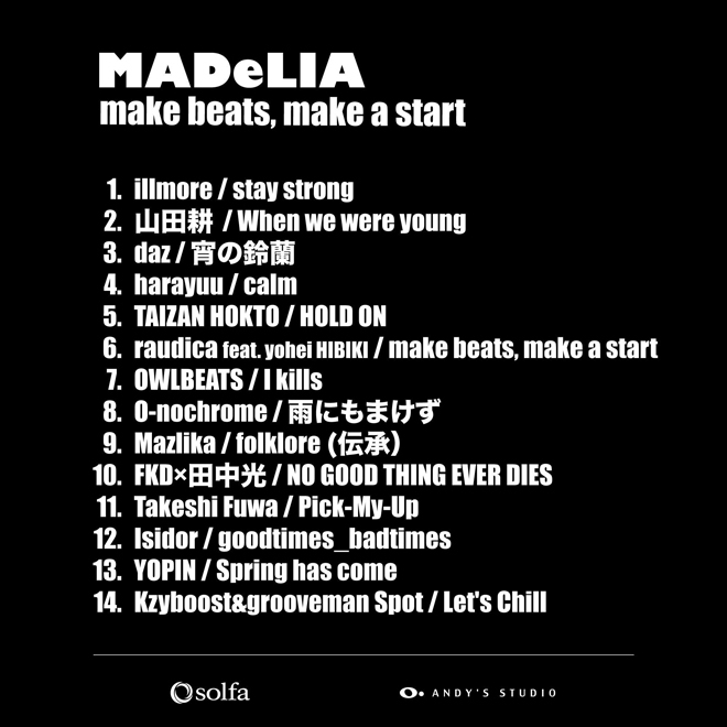 そんな<MADeLIA>に出演予定だったgrooveman Spot、illmore、OWLBEATS、KZYBOOST、FKD、そのほか総勢14組の有志によるメッセージのこもったビートコンピ『make beats, make a start』がイベント当日にbandcampにてリリースされた。