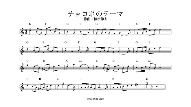 「チョコボのテーマ」の日本語/英語の譜面、背景画像はスクウェア・エニックスのゲーム音楽専門レーベル「SQUARE ENIX MUSIC」の公式Twitterで配布中。また、リコーダーバージョンの試聴動画も公開されている。