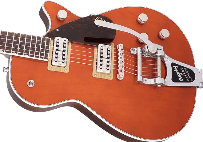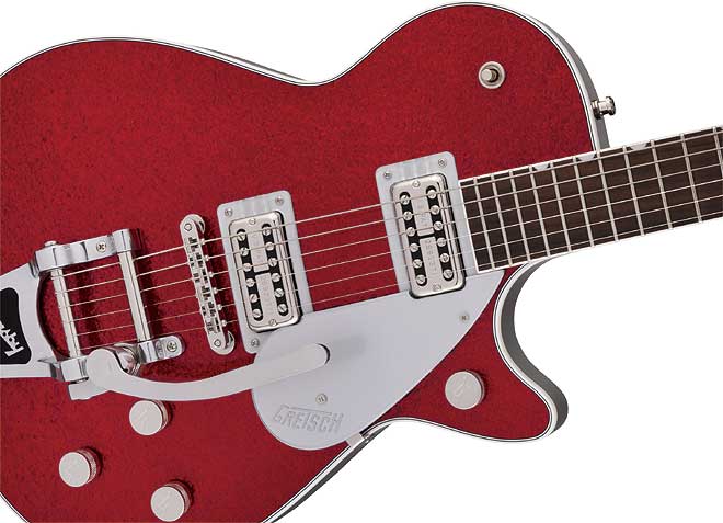 各弦のオクターブ調整が可能なアジャストマティック・ブリッジをダイレクト・マウントすることで、正確なイントネーションを実現、ハードなステージでも安心して演奏が可能だ。また、グレッチ・オリジナル・ピックアップのフィルタートロンを2基搭載し、スピーディーな弦交換を実現したストリング・スルー・タイプのBigsby B7CPヴィブラート・テイルピースを搭載している。サーキットには独自に開発された“Squeezebox(スクイーズボックス)”ペーパー-イン-オイル・キャパシター(コンデンサー)を導入し、トーンがフルの際に完全にバイパスされるノーロード・トーン・ポットを採用した。