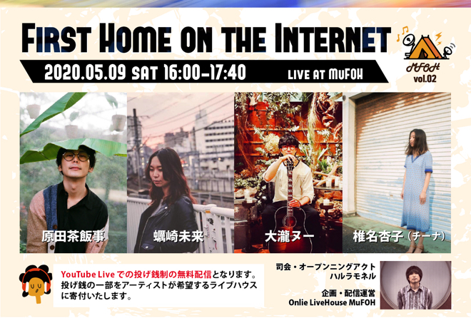 前身となったYouTubeチャンネル「Music From Our Home」での第1回配信に続く形で5月9日(土)に開催される初イベント<”First Home on the Internet ” -「Music From Our Home」 vol.2->には、椎名杏子(チーナ)、原田茶飯事、大瀧ヌー、蠣崎未来の4人が出演する。