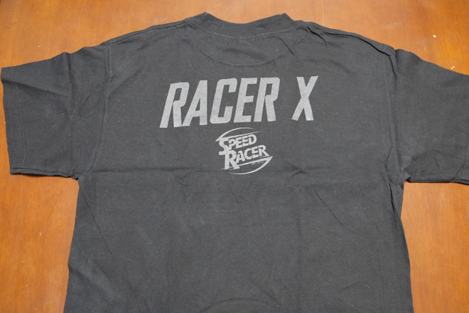 どでかくXって何?え?こんなデザインのX(X JAPAN)ってある?と思って背中を見たら、レーサーXでした。Li-sa-Xも大きくなったよね…なんて思いながらよく見ると、ん?ポール・ギルバートのレーサーXじゃなくて、『マッハGoGoGo』の映画『レーサーX』のTシャツじゃねーか。んもう紛らわしい。でもレーサーXというバンド名も『マッハGoGoGo』が由来なんだから、ま、いっか。
