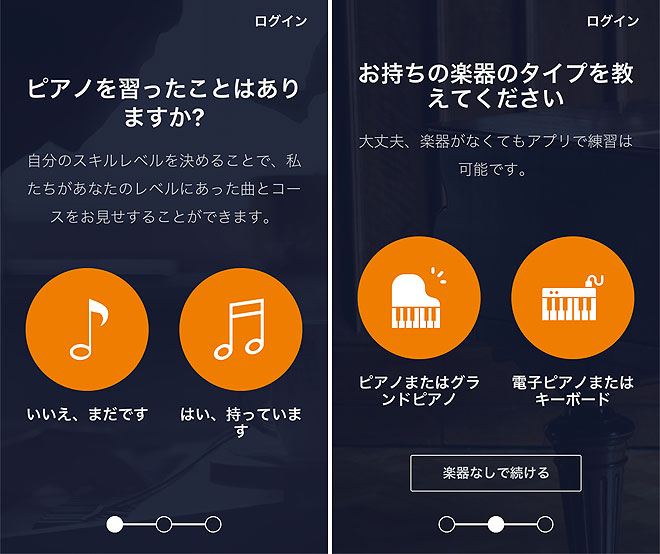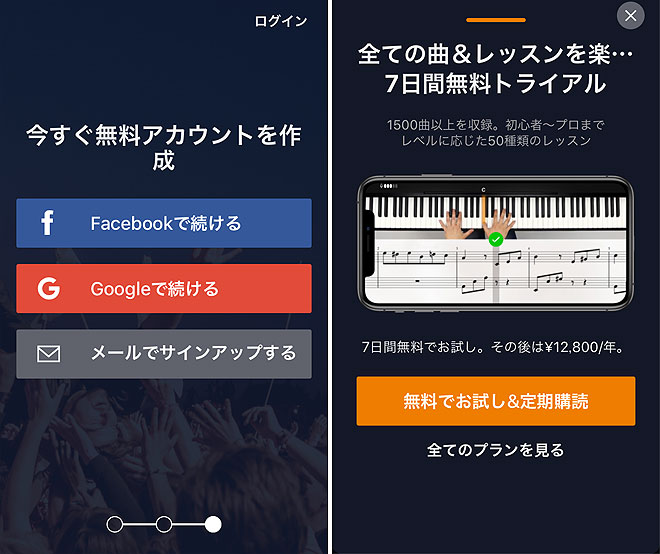 まずはアプリをインストール、最初の起動時にはいくつか質問に答える。「ピアノを習ったことはありますか?」では「いいえ」、次の「お持ちの楽器のタイプを教えて下さい」には「電子ピアノまたはキーボード」を選択。続いて、アカウント作成が促される。これをしないと先に進めないので今回は「メールでサインアップする」。