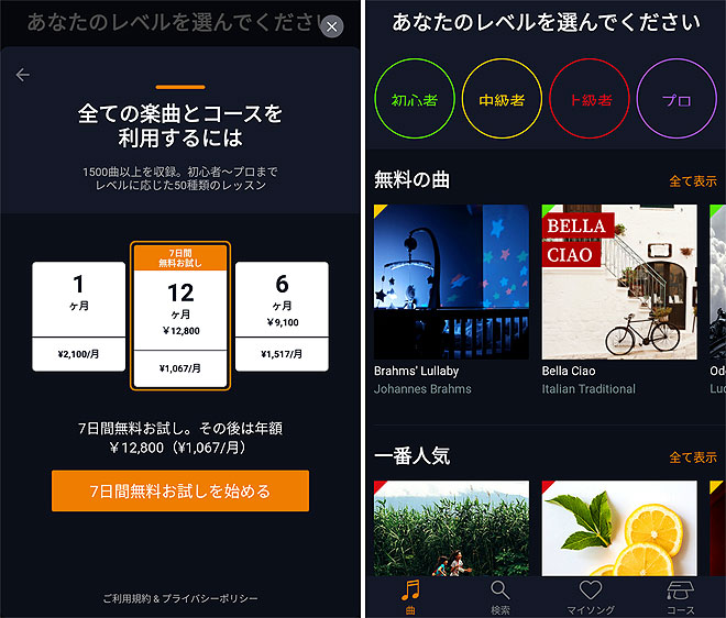 すると現れるのは「7日間無料トライアル」の紹介画面。「7日間無料でお試し。その後は¥12,800/年」とある。無料で試せるのはいいけど、解約し忘れたらいきなり1万円以上課金?! とびびってしまったので、「無料でお試し&定期購読」ボタンの下にある「全てのプラン」をタップすると、曲選択できるメニュー画面が表示されほっとする。