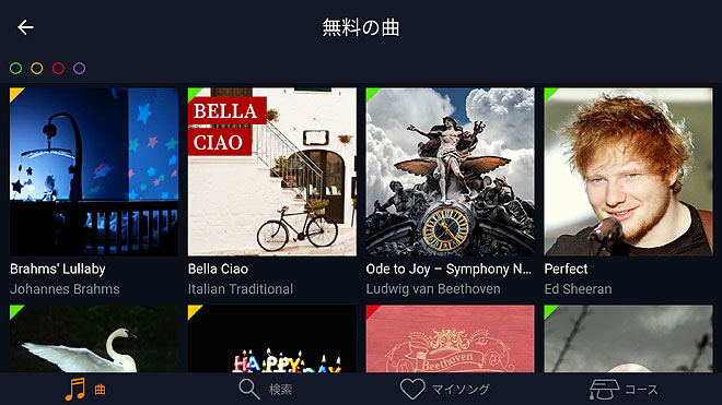 ▲無料の曲は体験時点で10曲。CDジャケット風の画像をタップして試聴、さらに「曲を習う」ボタンで譜面が表示される。無料の曲以外もタップで試聴は可能だが、続いて現れる「購読する」をタップすると、再び無料お試しを勧められる。