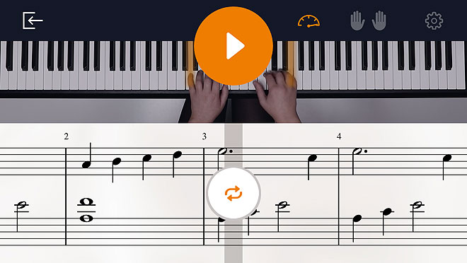 続いてのステップは「右手の練習にぴったりな簡単な曲」。「聖者の行進」や「ジングルベル」といった曲を練習する。知っている曲だし、5本の指の位置を動かさずに弾けることもあって、指示に従って数回繰り返すだけでスムーズに弾けるようになる。これには自分でも驚いた。やはり短い範囲を繰り返して練習するというのが効果的なようだ。