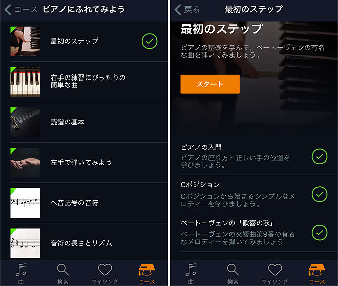▲各コースは複数のステップから成り、最初の「ピアノにふれてみよう」は7つのステップを用意(写真左)。最初のステップでは3項目をクリアする(写真右)。クリアしたステップには緑のチェックマークがつくので、どこまで進んだかが一目瞭然。