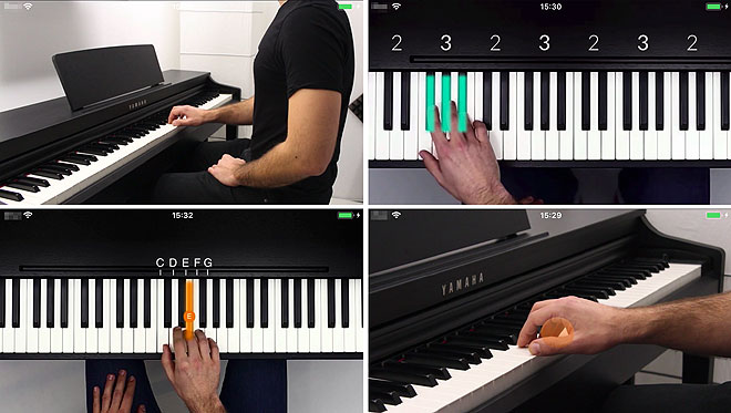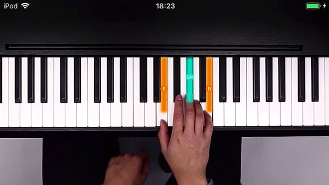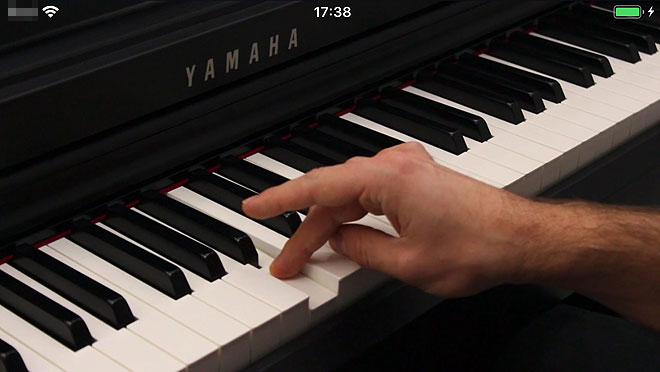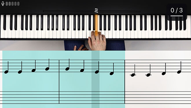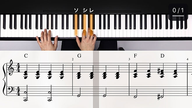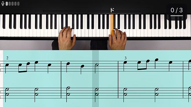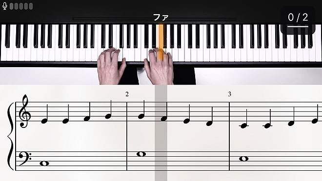 最初のステップは解説動画。「椅子の位置と姿勢について」「手の位置」「黒鍵について」「真ん中のド」といったチャプターで、ピアノの基礎の基礎から教えてくれる。続いていよいよ譜面を使ったインタラクティブなステップ。お手本動画に続いて「ドレミファソファミレド」を順に弾いていく。先に紹介した待機モードを使ったステップで、譜面の音符をちゃんと弾けば画面が右へ進む。このあたりはビギナーでも余裕だ。