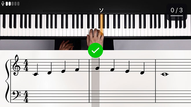 ▲右手親指をドの位置においてソまで順番に弾く。正しく弾ければ緑のチェックマークが表示され、譜面が進んでいく。動画に続き待機モードでの練習を3回繰り返すが基本の進め方。画面上にある鍵盤の映像、下の楽譜いずれの表示も小さなスマホでも問題なく見られる。