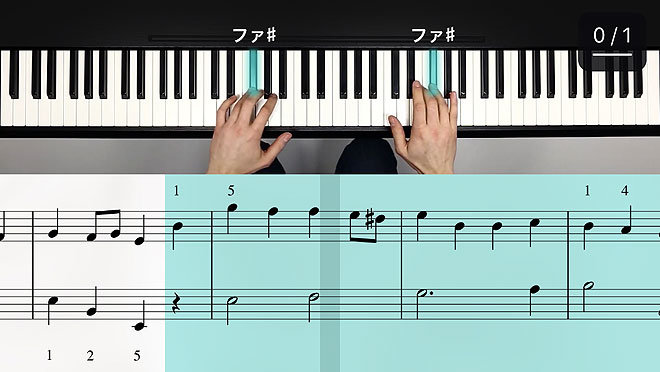 ▲左手で二つの音を弾くステップの練習曲は「夜が明けた」。数小節ずつに分けて、左手と右手を個別に練習。続いて両手で演奏。最後に全体を通して演奏するのだが、さっきまでは弾けていたはずの最初のパートが弾けなくなっていたりする。