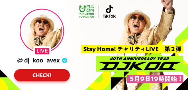 TRFのDJ KOOが5月9日に、自身のTikTokアカウントで<Stay Home! チャリティLIVE>を生配信する。