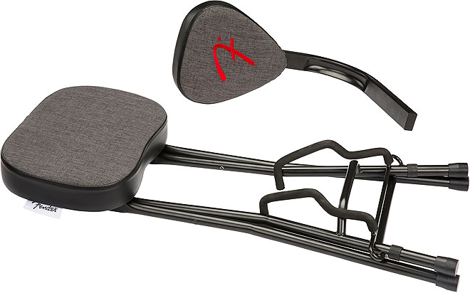 「351 Studio Seat」は、ギタースタンドと一体型のパフォーマー用シート。パッド入りのシートと背もたれは、練習や長時間演奏に最適。フェンダーピックの大定番である351シェイプをテーマとしたスタイリッシュなバックレスト(Fロゴ入り)を背にして座ると、通常のバースツールよりもはるかに快適だ。