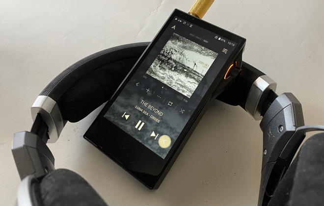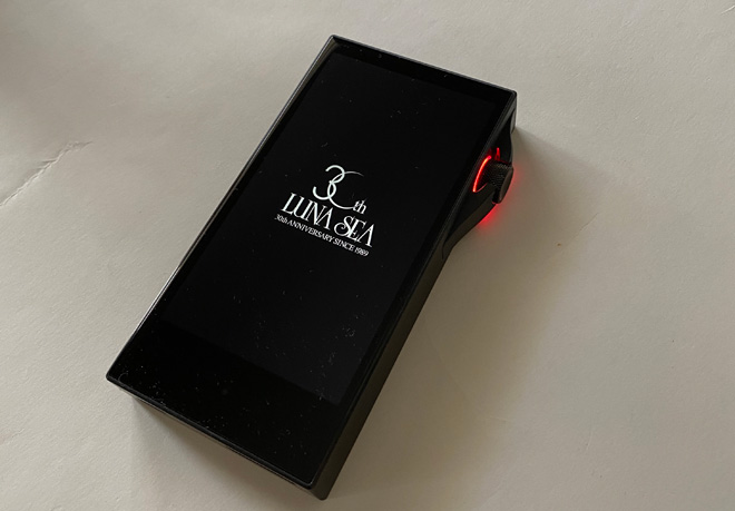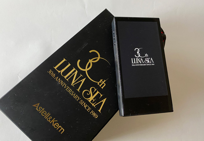 ▲Astell&Kern製SA700のスペシャルエディション『SA700 LUNA SEA 30th Anniversary Edition』。限定生産500台のハイレゾプレイヤー。起動時にはこのようなロゴが光り、24bitファイル再生時にはボリュームホイール部が月光をイメージさせるアンバーカラーが点灯するのも、このモデルだけの特別仕様。リアパネルには「LUNA SEA結成30周年記念ロゴ」がレーザーマーキングされている。