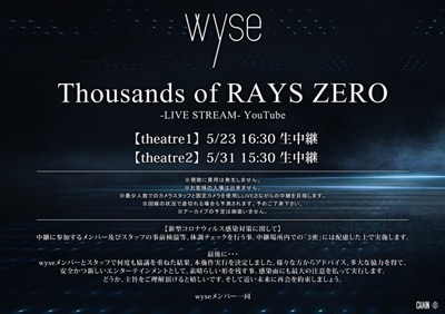 TAKUMA:はい。僕らもファンのみんなも楽しみに頑張ってきたし、なにかできないかってずっと考えていたんですが、5月23日と31日に、<Thousands of RAYS ZERO>と題してLIVE STREAM (無観客ライブを生中継)をします。当初のツアー予告どおり、ドラムはshujiさん(ex.Janne Da Arc)が叩いてくれるんですけど、セットリストもいまのwyseを見せたいということで、また組み直してるんですよ。しかも無料で閲覧できる。だからといって10曲とかの曲数ではないですよ(笑)。