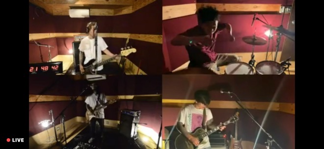ライブ自体は画面が4分割した状態で、右上から時計回りにShunichi Asanuma (Dr)、Yu-ki Miyamoto (G/Cho)、Hayato Mochizuki (G/Cho)、そして最終日を担うKeisaku“Sit”Matsu-ura (Ba/Vo)が映し出された。Shunが大きくドラムをかき鳴らし、まずは新作の冒頭を飾った「Passion」からライブはスタート。始まった瞬間、まず驚かされたのはその臨場感と生々しさだ。とても別日に録ったとは思えないほどの連動性を持って、しがらみを振り切るように進んでいく。各々ひとりずつのプレイが重なり混じり合ったサウンドなわけだが、数多の現場を経験してきた彼らには、もはやメンバーの姿が見えているのであろう。アクセルの踏み出し具合もしっかり噛み合う。Sitも手を突き上げ、「歌ってくれよ!」と大きな声をあげ、奥深いグッドメロディーが秀逸な「Bad」へ。ツアーがなくなってしまった今、新作からの連投が本当に気持ちいい。