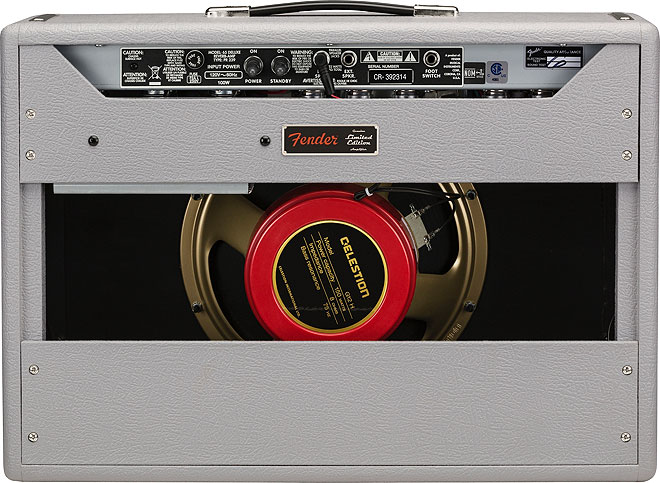 今回登場の限定生産モデルはNormalとVibratoのデュアルチャンネル仕様となっており、外装にはスレートグレイカラーのビニールカバーにブラックのグリルクロスを装備。その他、Celestion Redbackスピーカー、2 x 6V6パワー管、1 x 5AR4整流管、4 x 12AX7プリ管、2 x 12AT7真空管、真空管駆動のリバーブ&ビブラートを内蔵し、各エフェクトのON/OFF用フットスイッチが付属する。