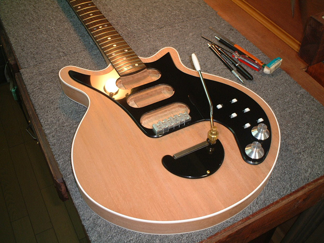 100年前の暖炉の木なんだとか、パーツはバイクのバネだとか、レッド・スペシャル(例のブライアンのオリジナルギターのお名前。以下レスペ)にはほのぼのエピソードがたくさんあるのは皆さんご存知のとおりだけど、最大の特徴でありすぐにでも真似できるポイントとして、13通りの音が出せるPU回路があるので、まずはストラトにスイッチを増設してそれを真似てみたりした。「なんじゃ、普通のハムより変な音だな」とか「これ、使えるか?」「うわ、ハーフトーン出なくなった」というガックシな結果を元に、一般的なパラレル接続も加味してバリエーションに実用性を持たせたりもするのだけれど、ブライアン・メイのトーンには1mmも近づかない。学ぶことはたくさんあったけど、ブライアンのサウンドは遥か彼方だった。