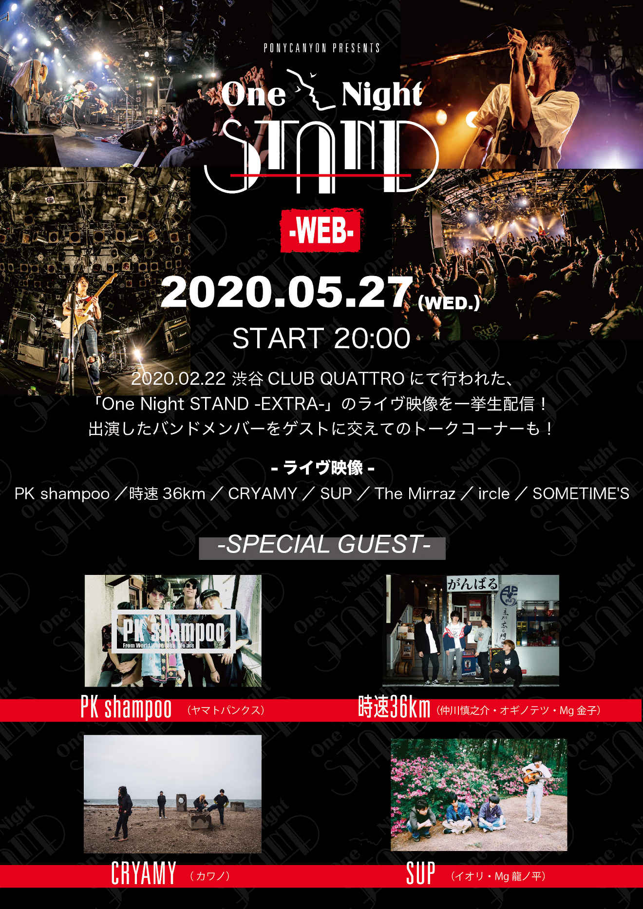 今回の配信では2月22日(土)渋谷CLUB QUATTROにて開催された<One Night STAND -EXTRA->のライブ映像をプレミア公開する。この映像は、出演した「PK shampoo」「時速36km」「CRYAMY」「SUP」「The Mirraz」「ircle」「SOMETIME’S」全7組ライブ映像のダイジェスト編集版。アーカイブ配信のない一夜限りの公開となる。