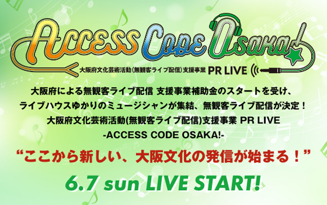 <大阪府文化芸術活動(無観客ライブ配信)支援事業 PR LIVE -ACCESS CODE OSAKA!->は、この補助事業の趣旨等を広く府民等に周知し、府民に自宅に居ながらにして文化芸術を楽しんでもらえる機会を提供するとともに、各施設の取り組みを促進するため、大阪府内のライブハウスからなる、大阪府無観客ライブ配信支援事業プロモーション共同企業体が受託し開催される。
