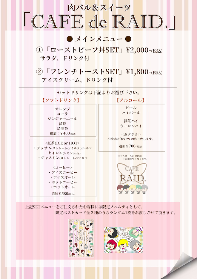 「CAFE de RAID.」では、シェフが作る「ローストビーフ丼SET」「フレンチトーストSET」がメインとして提供され、the Raid.のメンバーがウエイターとして接客を担当する。そして店内にはthe Raid.の楽曲が流れている。