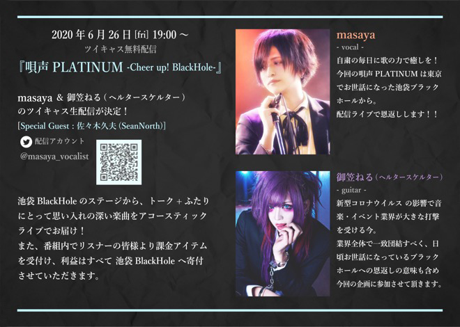 masaya (ex.EVERSSIC, BLESSCODE)とヘルタースケルターの御笠ねるが6月26日、池袋BlackHoleのステージからツイキャス生配信『唄声PLATINUM -Cheer up! BlackHole-』を実施する。