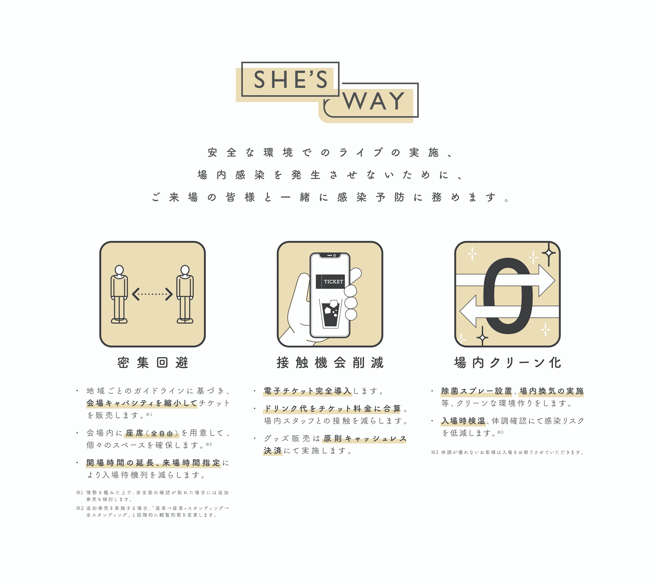 また、より安全なライブの環境作りと場内感染の発生防止のため、各地域のガイドラインとは別に、独自の取り組み「SHE’S WAY」を実施。“密着回避”、“接触機会削減”、“場内クリーン化”の3つの取り組みを通じて感染予防に努めていくという。