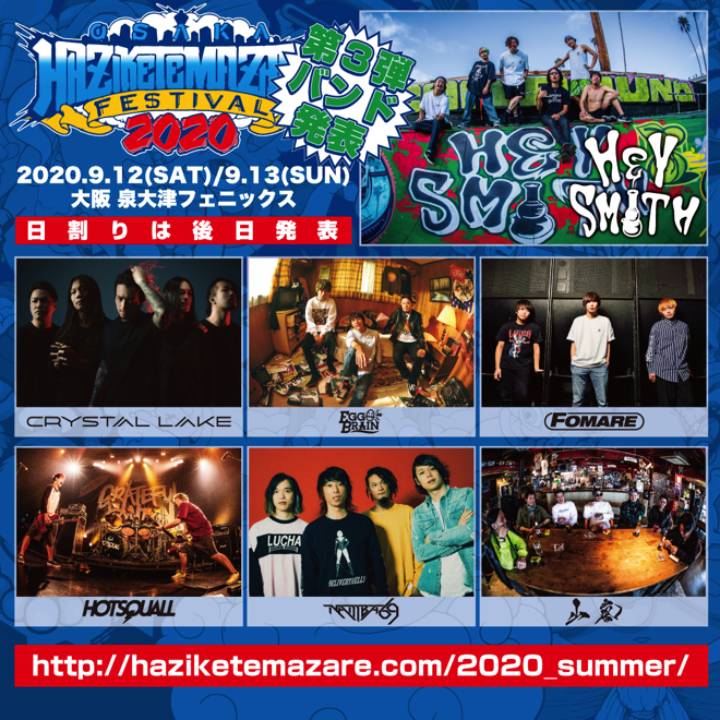 9月12日(土)、13日(日)に大阪・泉大津フェニックスで開催されるHEY-SMITH主催イベント<OSAKA HAZIKETEMAZARE FESTIVAL 2020>の出演者の第3弾発表が行なわれた。