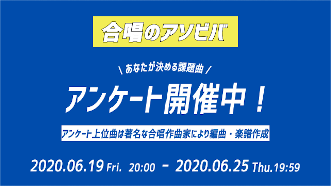 “みんながフランクに楽しめる音楽の遊び場を作る”というコンセプトではじまった「エイベのアソビバ」の特別企画「合唱のアソビバ」にて、合唱の課題曲を決めるアンケートが始まった。