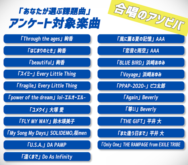 その課題曲を決めるアンケートが始まっている。アンケート対象楽曲は以下の通り。これらの候補楽曲はエイベックス所属アーティストの楽曲の中から合唱に合いそうなもの、逆に合唱にすることで化学反応が生まれそうなものなどの基準をもとに選ばれている。