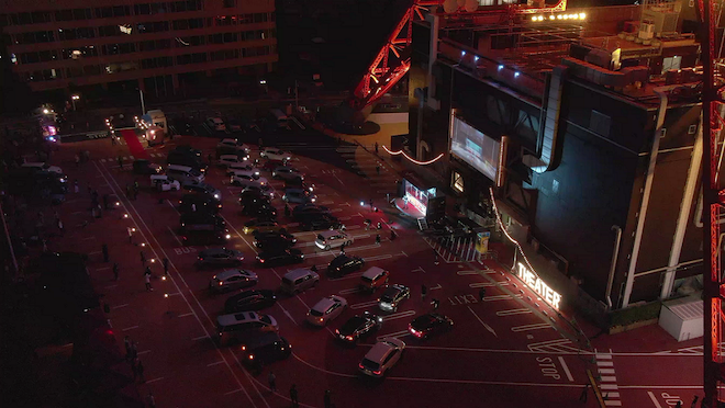 車に乗ったまま映画が鑑賞できる、ドライブインシアター。今回のイベントでは『スパイダーマン:スパイダーバース』が上映された。