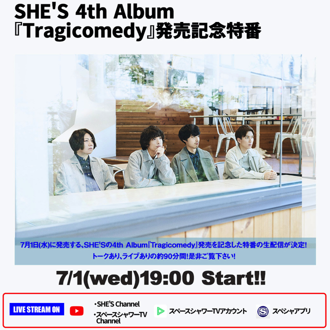 SHE’Sのニューアルバム『Tragicomedy』の発売を記念した特別番組が、リリース当日の7月1日(水)に生配信されることが決定した。