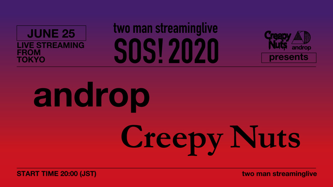 andropとCreepy Nutsが6月25日(木)、無観客有料配信ライブ<SOS! 2020>を開催した。同公演のオフィシャルレポートをお届けする。