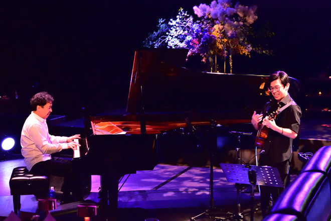 小曽根はアート・ブレーキー、ディジー・ガレスピー、チック・コリア、ゲイリー・バートンらに可愛がられたという。US/CBSからデビューしてもう37年、もうすっかりベテランの域だ。今度は彼が若手実力者を多くの人々の前に推奨していく番だ。ということで3曲目には若干19歳のウクレレ奏者Rio(斉藤梨央)が小曽根にジョイン、勿論サプライズ・ゲストである。ローティーンの頃からハワイで注目され、このところ我が国でも話題を呼んでいるミュージシャンだ。そんな二人が披露するのはチック・コリア作品としてお馴染み「LA FIESTA」。イントロはRioのプレイ、いきなりオーディアンスを驚かせる。そのウクレレに小曽根のピアノが被さる。まさにこれぞジャム・セッションという雰囲気の中で二人は自由に泳ぎまくる。