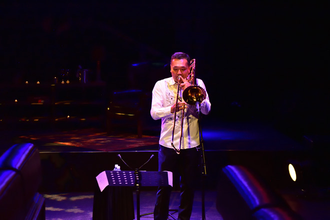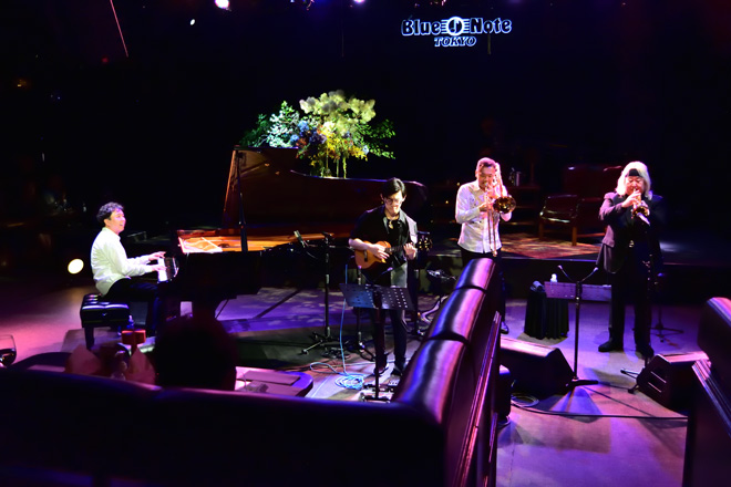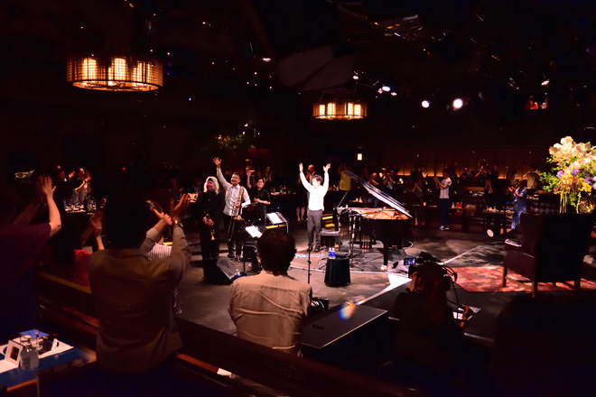 勿論この後はアンコール!小曽根はもう一人のフレンドを呼び込む。トランペッター/コンポーザー/アレンジャー、そしてBlue Note TOKYO All Star Jazz Orchestraリーダーとしても馴染み深いエリック・ミヤシロ。そして演奏前に小曽根は“リヴィング・ルーム”プロデューサー、神野三鈴を紹介する。小曽根、エリック、英二郎、Rioの四人でジャズ・スタンダード、ホレス・シルヴァー「THE PREACHER」。ダンモ・ファン(もう死語か…汗)お馴染みの55年作品。