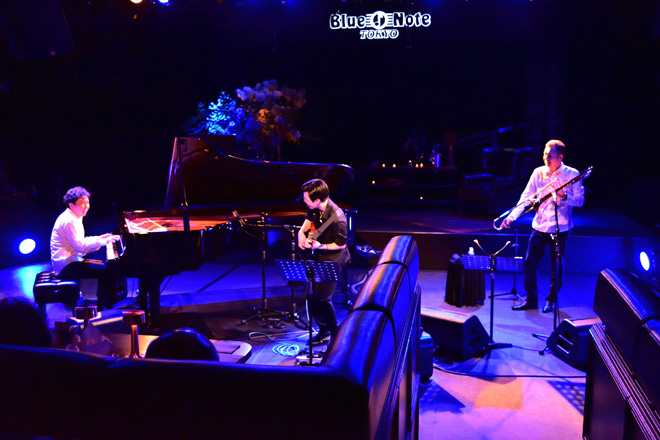 そして8曲目、ここで二人にRioが再ジョイン。中川のアルバム『E』からで「INTO THE SKY」、作曲は英二郎。Rio、中川、小曽根の各パートをフィーチャーしてのいかにもラスト・ナンバーらしいドラマティックな雰囲気が場内を包む。エンディングがそれはそれはデリーシャス、大拍手だ。