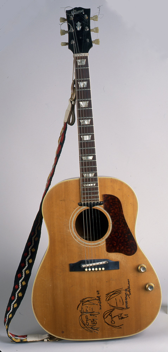 ▲ベッド・インの際に使用したジョンのギター(ジョンによるジョンとヨーコのイラスト入り)/Photo by Miki Slingsby Courtesy of Yoko Ono