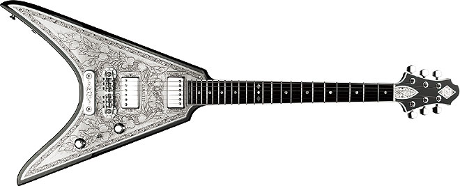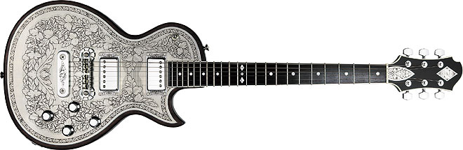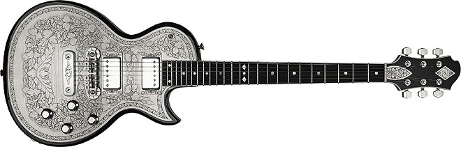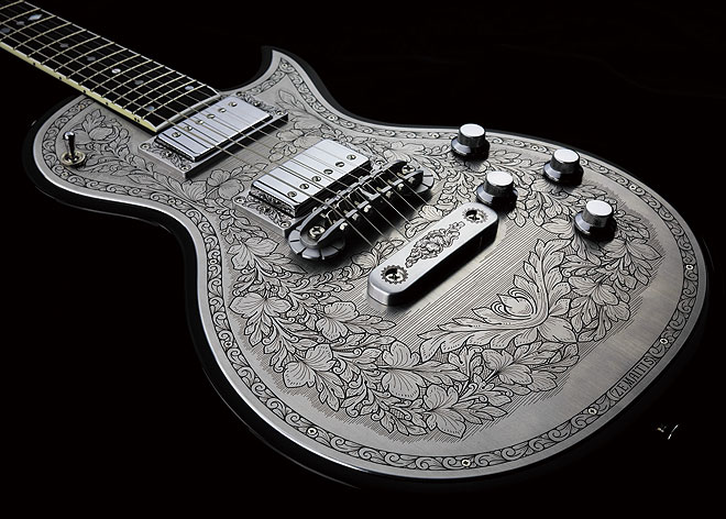 ▲MFGV22 BKはニュー・デザインのVシェイプ・ボディに合わせたゼマイティス伝統の彫金デザインを施した。CTS製のポットを用いたボリューム・コントロールとトーン・コントロール、スイッチクラフト製3ウェイ・ピックアップ・セレクター・スイッチを搭載。
