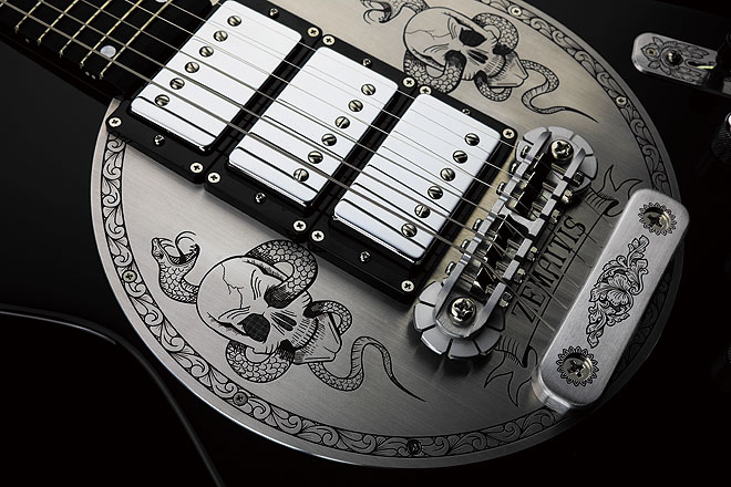 ボディとネックは共に上質なアフリカン・マホガニーを、フィンガーボードはエボニーを採用。635mmのスケールを採用し、ミディアム・ジャンボ・サイズの24フレット仕様になっている。ピックアップは、メタル・カバードのゼマイティス・カスタムPAFスタイル・ハムバッカーを3基搭載する。CTS製のポットを用いた各ピックアップ・ボリュームとマスター・トーンを搭載し、CRL製3ウェイ・ピックアップ・セレクター・レバー・スイッチを装備。ミドル・ピックアップのボリューム・コントロールはプッシュ/プル・スイッチを兼ねており、ミドル・ピックアップのオン/オフが切替可能だ。ミドル・ピックアップはプルでオンとなるが、単体での音は出ず、ネックまたはブリッジまたは両方のピックアップにミドル・ピックアップを付加する形になっている。トーンのキャパシターはオレンジ・ドロップを使用。信頼性の高いゴトー製のロッキング・チューナーでチューニングの安定性を確保した。ヘッドストックにはダイアモンド型のZロゴ・プレートではなく、ヴァーティカルZEMAITISのロゴ・プレートが取り付けられている。