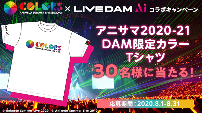 歌唱キャンペーンでは、参加者のなかから抽選で30名にここでしか手に入らない「アニサマ2020-21 DAM限定カラーTシャツ」がプレゼントされる。課題曲は延期が決定した<Animelo Summer Live 2020 -COLORS->への出演を予定していたアーティストの楽曲だ。応募期間は8月1日〜8月31日まで。