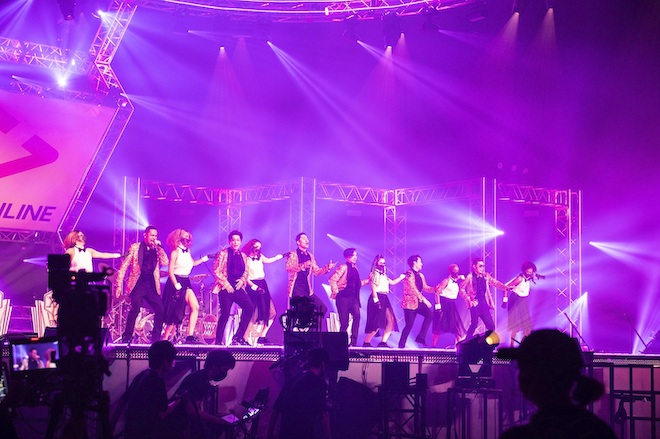 1曲目は今年1月にリリースされた「瞬間エターナル」をライブアレンジで歌い上げた。息つく間もなく、続けて夏のムード全開のナンバー「YEAH!! YEAH!! YEAH!!」を披露。カメラ越しに視聴者を煽るパフォーマンスや、メンバーたちの間を3台のドローンが高速移動するなど躍動感あふれる映像はオンラインライブならでは。