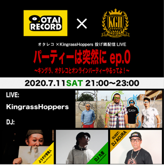 2020年7月11日(土)21時より、オタイオーディオ株式会社が運営するOTAIRECORDとYouTube動画再生回数2000万回を誇る岐阜柳ケ瀬が生んだパーティーピーポー“KingrassHoppers”がコラボ投げ銭配信ライブ<パーティーは突然に ep.0 〜キングラ、オタレコとオンラインパーティーやるってよ!〜>を開催する。