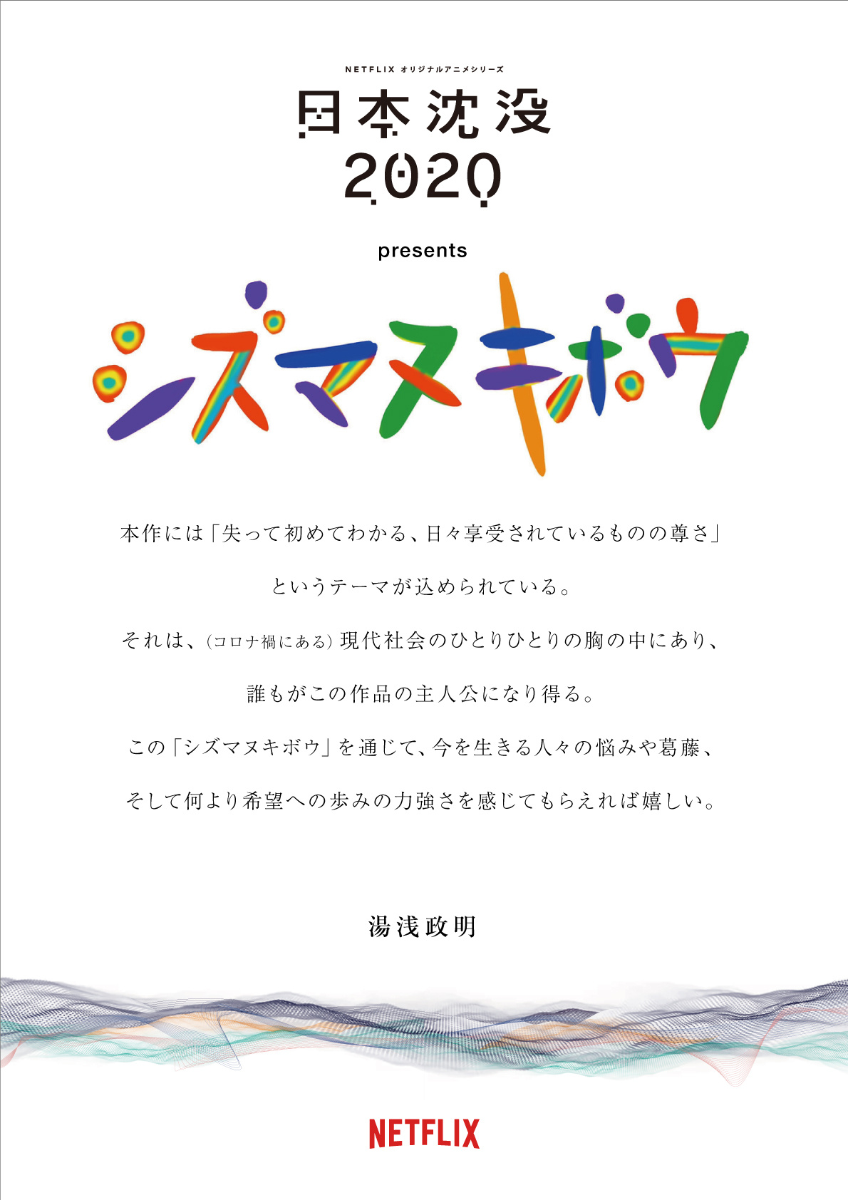 『日本沈没2020』には「失って初めてわかる、日々享受されているものの尊さ」というテーマが込められている。それは、(コロナ禍にある)現代社会のひとりひとりの胸の中にあり、誰もがこの作品の主人公になり得る。この「シズマヌキボウ」を通じて、今を生きる人々の悩みや葛藤、そして何より希望への歩みの力強さを感じてもらえれば嬉しい。